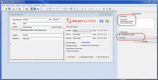 Next define you ‘Tab Control’ with a Tab for each Document Type. In my example you see a Tab called Document, Engineering Change and Non Conformance. You will also see that this control is “Controlled by Variable’ <DocType>