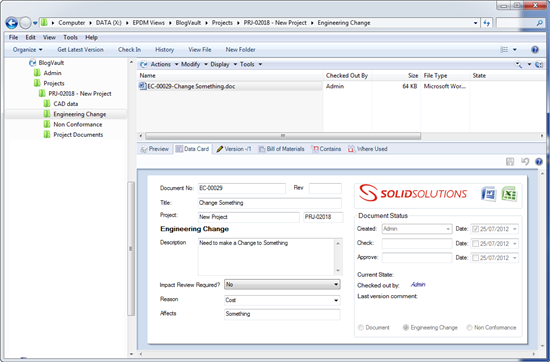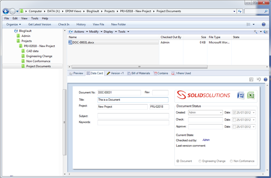 When I create a new Project I generate 4 Sub-Folders; CAD Data, Project Documents, Engineering Change & Non Conformance. The documents added to the three non CAD folders may all be Word Documents (for example) but the requirements for describing those files will be different. I could create one big DataCard that covers all eventualities but let’s not confuse the users and work a little smarter. Using Control Logic on a common Document DataCard to control Tab visibility and some copied properties in the Project Template we can use the same default Document DataCard and have it display different Variables depending on which Folder the File is added to.