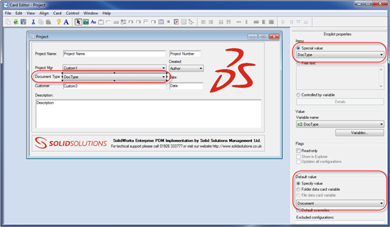 Both my Template and Folder card have been modified to include a Drop List linked to the <DocTYpe> variable and an EPDM List which contains the three options we have discussed. I have set the Default Value to be “Document” and marked it as Read Only so that it can’t be changed by accident. The correct value will be assigned to the Engineering Change and Non Conformance Folders by the Template.