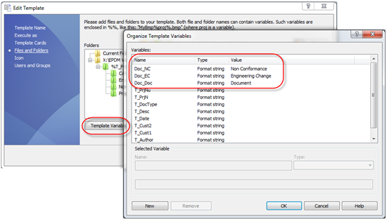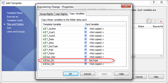 Now select the 'Engineering Change' Folder in the Template and via the RMB (Right Mouse Button) Shortcut menu select Properties. We only need to copy one Variable explicitly since the default behaviour of EPDM is for Folder variables to always be inherited by sub folders. On teh Copy Variables Tab, locate the Variable created with the value 'Engineering Change' and copy it to <DocType>.