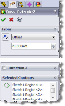 Each "shape" in the sketch would likely be extruded to different depths but it is convenient to sketch them all in one for dimension referencing. The contour select tool is primarily available in the Extrude and Revolve Boss and Cut features. When the software feels it is needed (i.e. multiple shapes detected) the contour option appears prompting you to graphically select the shapes you wish to work in.