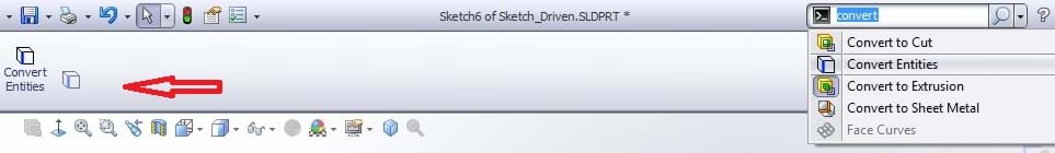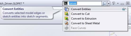 You can use this by either selecting the tool in the top tight corner of the SOLIDWORKS interface or using the keyboard shortcut "W", it then allows you to enter a text string containing the name of the tool we wish to use and it will conveniently search all tools that contains the text you enter: