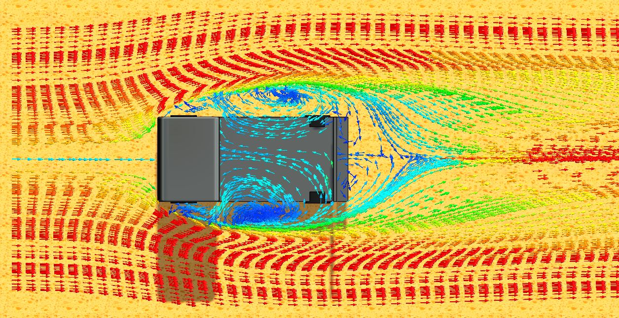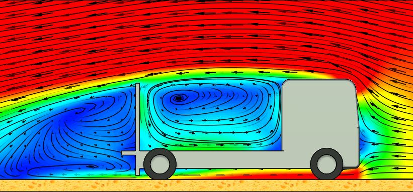 The plots below show the reason why this seemingly impossible speed can be achieved. The air dam at the back of the truck creates large vortices that rotate directly behind it - just where the cyclist (Guy Martin) is positioned. This not only dramatically reduces the aerodynamic drag forces but actually creates a positive airflow that assists Guy as he pedals furiously.
