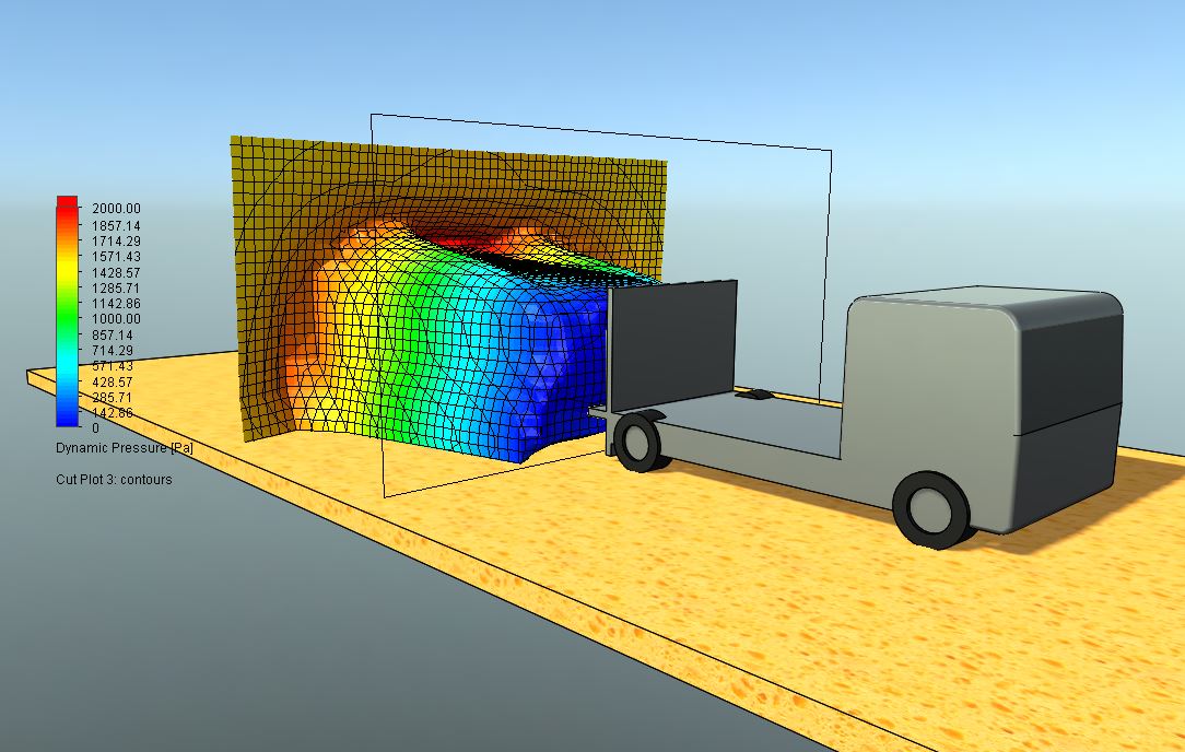 Another type of plot is a 'Cut Plot' with a '3D offset'. Below I have plotted the dynamic pressure results on a 2D plane exactly through Guy's cycling position (the black rectangle). I have then offset the values in the 3rd direction to produce this 'mountain map'. The plot shows very clearly that Guy would be in a pool of relatively slowly moving air (the blue region) and that this is quite wide and deep. In reality it oscillates as I was able to prove in a transient study but there is a sufficiently large stable region for Guy to be protected - provided he stays within the pool. Moving outside the pool would be very dangerous - it would mean hitting a wall of air rushing at over 100 mph and could have been fatal.