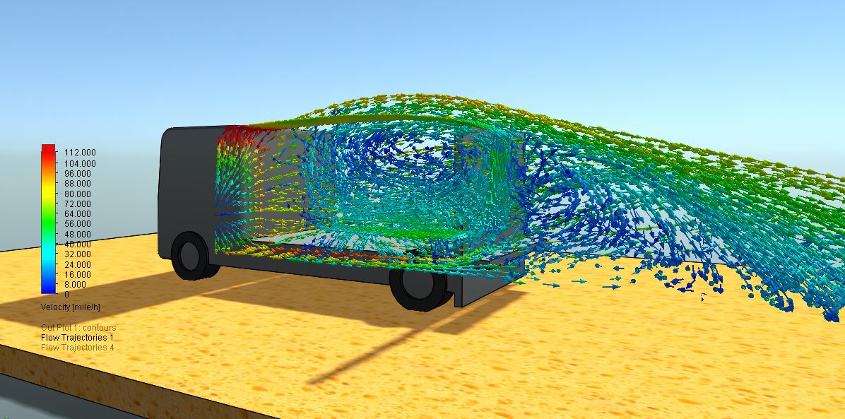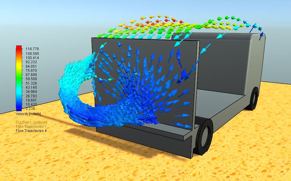The set up is actually very simple. You just model a truck and a land surface in SOLIDWORKS 3D CAD and run the Flow wizard within SOLIDWORKS Flow Simulation. All you need to do is add the global velocity (in this case 112 mph) and adjust the size of the domain (the volume of space that includes the truck, the ground and enough air to see the upstream and downstream airflow). An additional refinement was to model in the effect of the moving road - or in this case the sand on which the record attempt was made in South Wales. I did this with a 'Moving Wall' boundary condition.