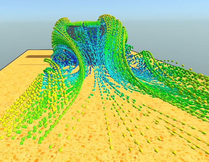 The final image shows a view from the rear which explains why the TV programme had trouble filming the truck. The truck creates large vortices behind the air dam and these pick up the sand and create a maelstrom of fine sand particles.