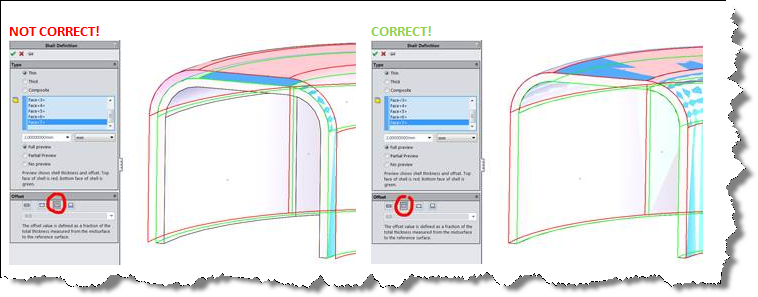 Using the outside faces of this component to specify a shell, it now gives a preview of the virtual thickness….