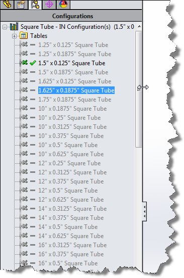 So here is a snap shot of the listed configurations, generated by an excel based design table (note this isn't a requirement but the fatest way of generating configurations.
