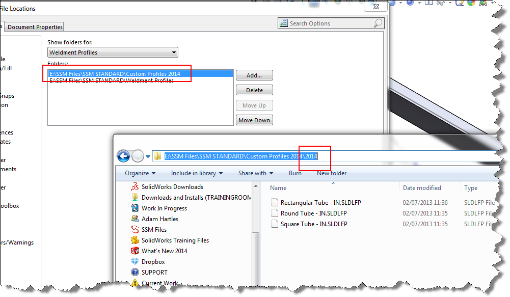As mentioned the folder structure has to be a little different for these- basically they need to be located one less folder deep. In the SOLIDWORKS Options - File Locations - Weldment Profiles, the linked folder in the past needed to have two subfolders nested beneath (in 2013)- the Standard and the Type, in this Type folder would be all of the separate documents for each profile. For these configuration based profiles, you only need one sub folder for the Standard- the file residing in that folder represents the Type and then the configuration represents the size. All a little confusing, so hopefully this image captures it all!!