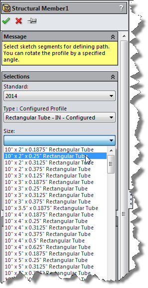 When using these profiles within the Structural Member feature, the familar pull down menus are still used, but the profile is tagged with the suffix "Configured" to show that it uses the new 2014 style.