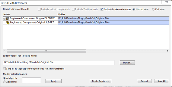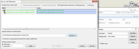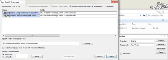 This dialog allows you to specify new part names and file locations for these new parts, but most importantly it is retaining the reference link between the two new files. Saving the new files with new names can be done by adding a Prefix, Suffix or using the Find/Replace function commonly used in Microsoft Office…