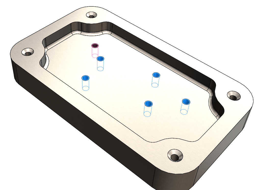 Points could also be placed using ordinate dimensions, to pattern features with changing spacing along larger lengths, particularly useful if repeated holes are positioned from a datum edge. SOLIDWORKS 2014 includes better visual feedback for patterns. The "Seed" feature (original) shows in pink, while the "Instances" (Copies) show in blue.
