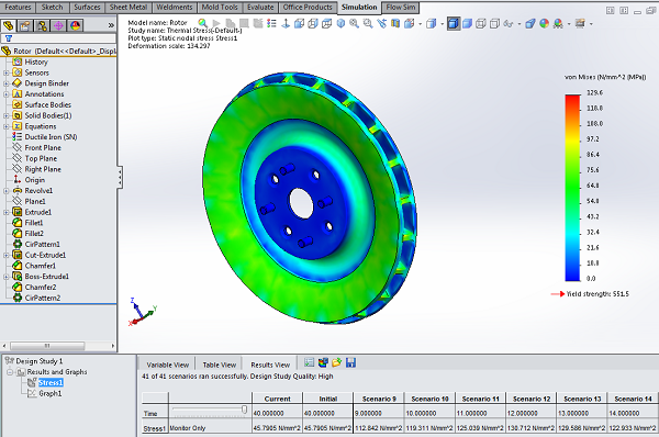 To many users, and certainly those who have attended the SOLIDWORKS Simulation training course, this is not news. The training example is a wishbone suspension system that experiences a range of loads and a variety of material thicknesses. Great - but what happens if the parameter to vary is not a load or a material or a dimension? For instance, let's use a brake rotor as an example.