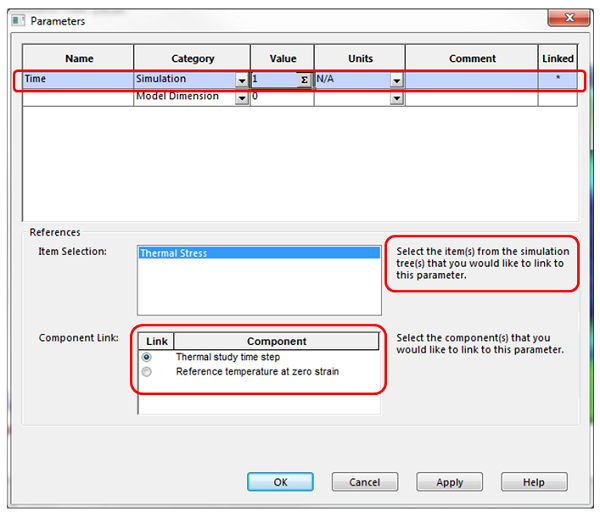 With the Parameter window open, all you need to do is select the study name at the top of the relevant Simulation study tree. When you do so the Properties that can be linked to a Parameter are shown in the window (see image below) and the radio buttons can be ticked to switch them on. You can now select the 'Apply' button and you should see an asterisk in the right hand column of the table to indicate it has successfully linked.