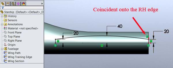 We can see that in this case there is a coincident relation between the top right corner of the profile and the right edge of the part. This is stopping the profile from following along the guide curve.