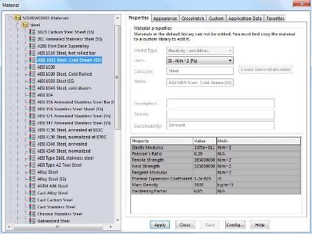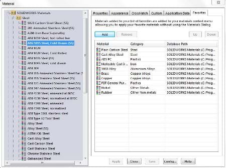 If applying a range of specific materials to your models is something you have to do regularly then the materials favourites bar is something you need to be using. Whether you use a library of customized materials or just one standard SOLIDWORKS material, making use of the favourites bar can save you a huge amount of time searching for and applying your materials.