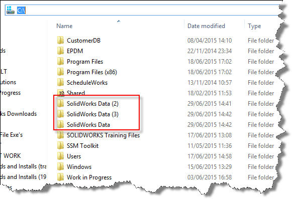 b) Tidy up the names- I prefer to suffix the Data folders as per the version of SOLIDWORKS connected to is- i.e. C:\SOLIDWORKS Data 2015. Ensure you have all sessions of SW closed before you do this.