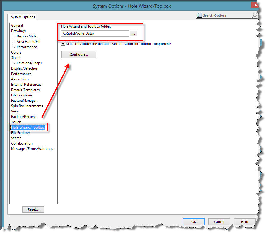 Re-direct SOLIDWORKS to this newly named folder- you (and any colleagues in the case of a shared toolbox) will get an error on startup- this is because the folder was renamed, so go back into the System Option and then redirect the folder to the new name.