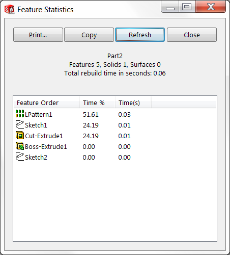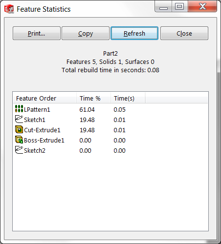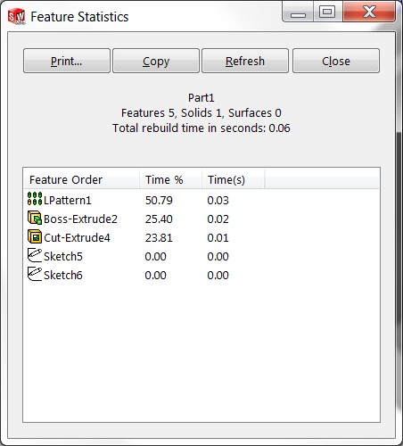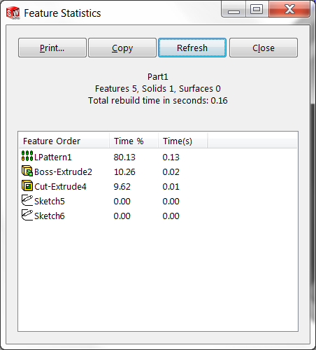 Easy enough. Now let’s run diagnostics on this part to check the rebuild times. Select Tools->Feature Statistics. A window will pop up listing the rebuild times for each feature. At this point Linear Pattern is taking 61% of the time to rebuild the model.
