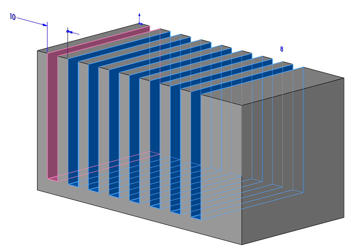Finish off with a Linear Pattern of the Extruded Cut. Make 8 instances of the feature along the length of the box. Set spacing at 10 mm.