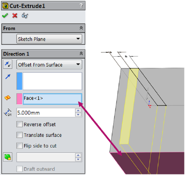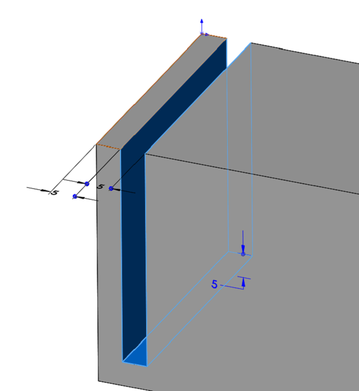 Create another rectangular sketch on the top face of the box. Use it to perform an Extruded Cut offset by 5 mm from the bottom face of the box.