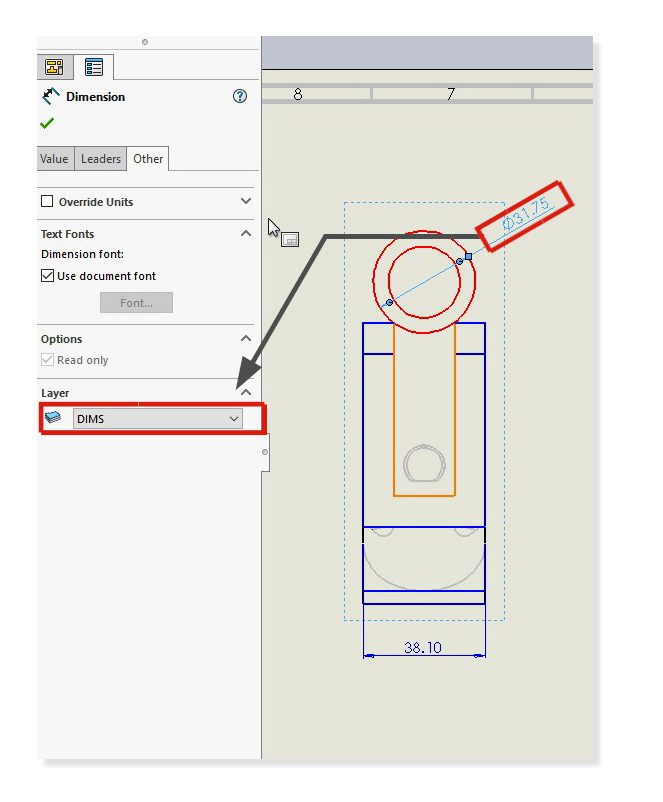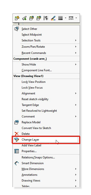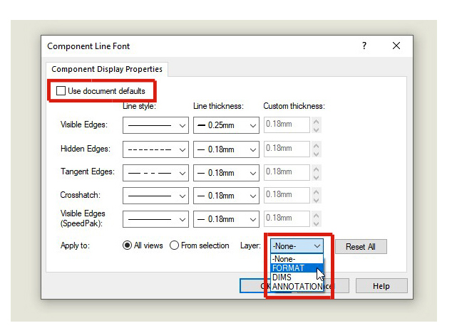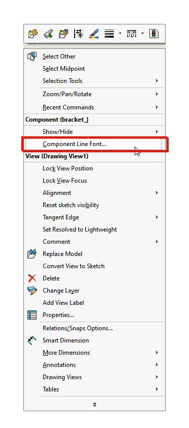One other common question related to Layers is the ability to set a component’s outline to a layer style. To do this you right click on the part within a drawing view and choose “Component Line Font”