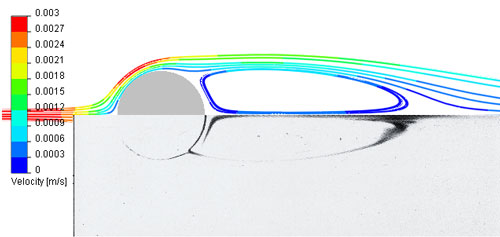 the cylinder. The image below shows the flow trajectories of result of the FlowSimulation above and an image of such flow below for comparison.