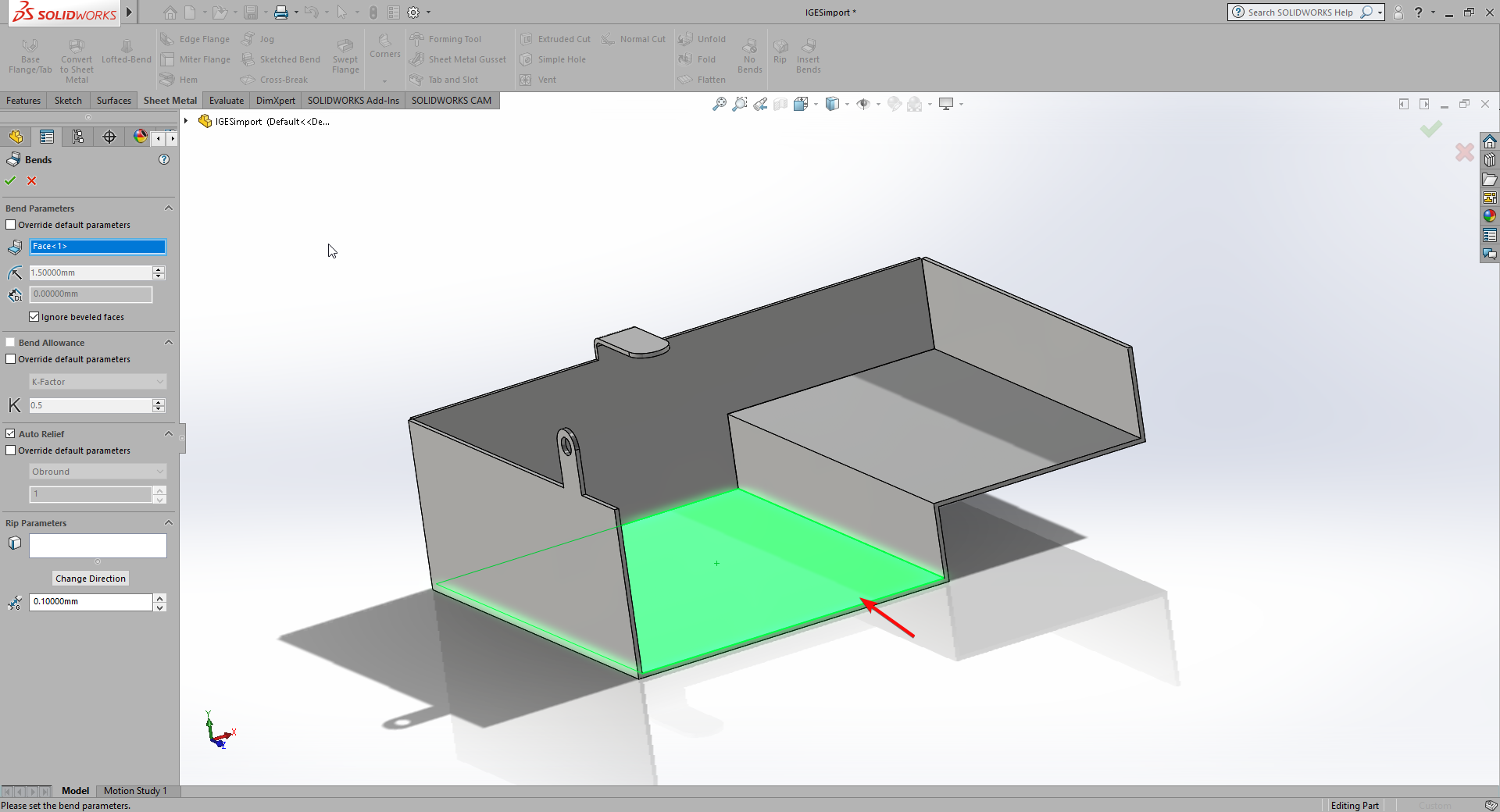 1) Firstly, click the Insert Bends Button located in the Sheet Metals tab on the far right.