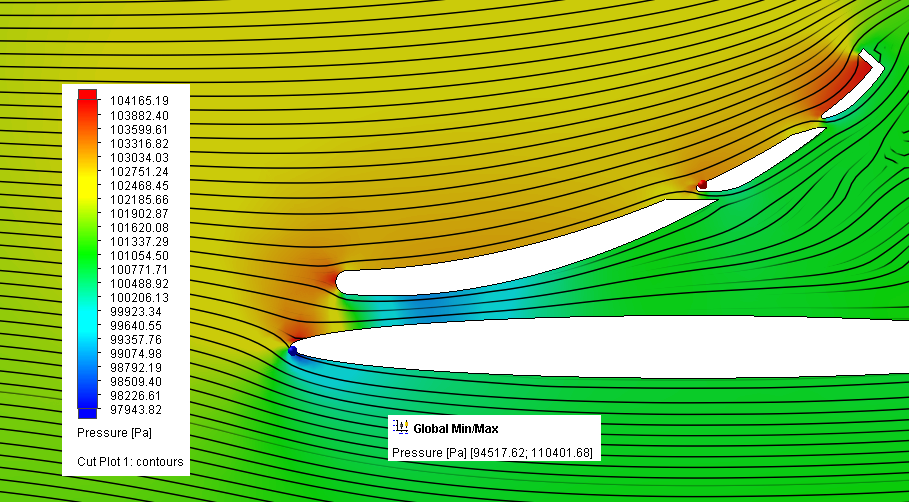 lower wing and the max pressure is on the front / top of one of the upper