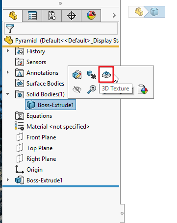After setting the required size, the 3D texture command can be triggered by selecting the body from the feature tree and then pressing the button shown below.