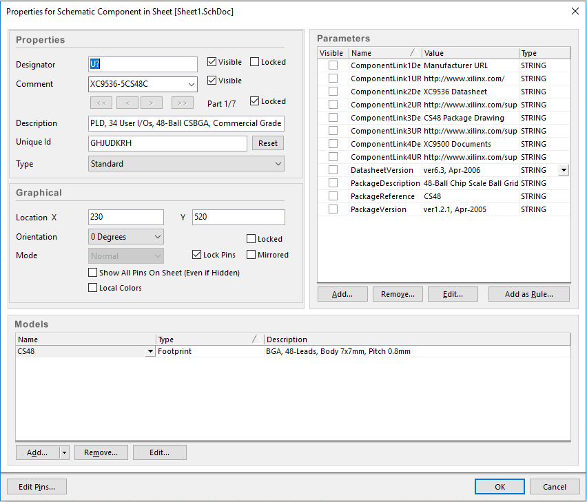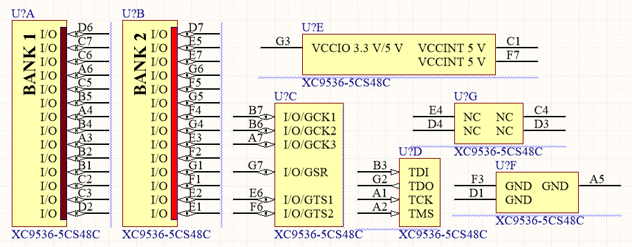Using a XC9536-5CS48C from a Xilinx library as an example, this