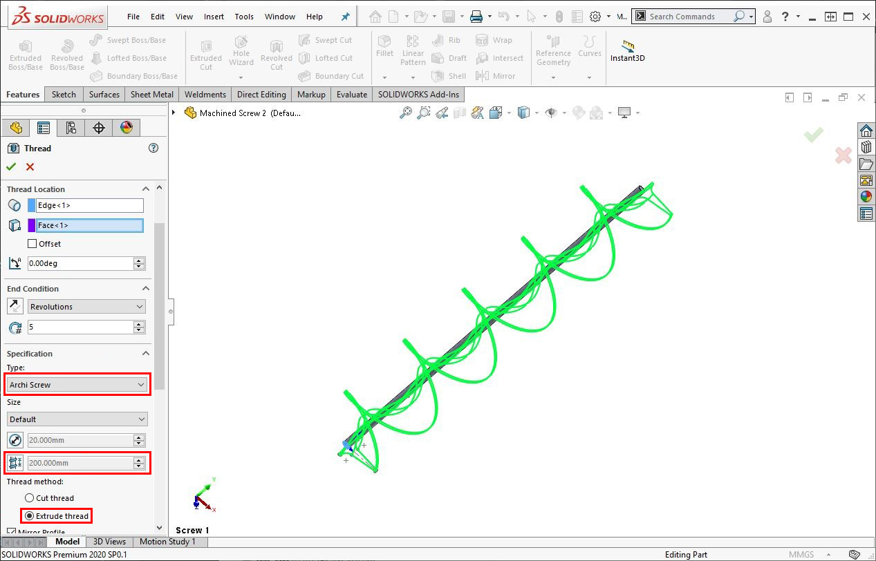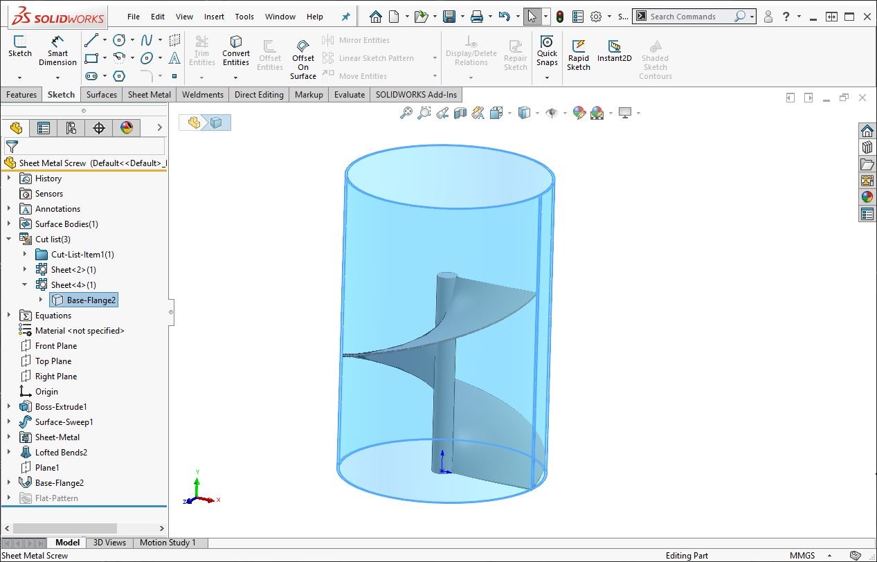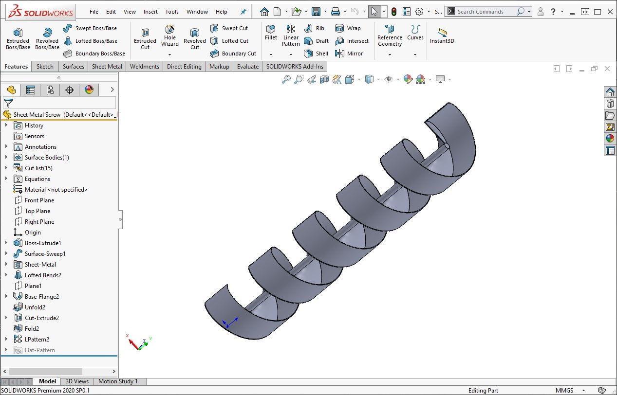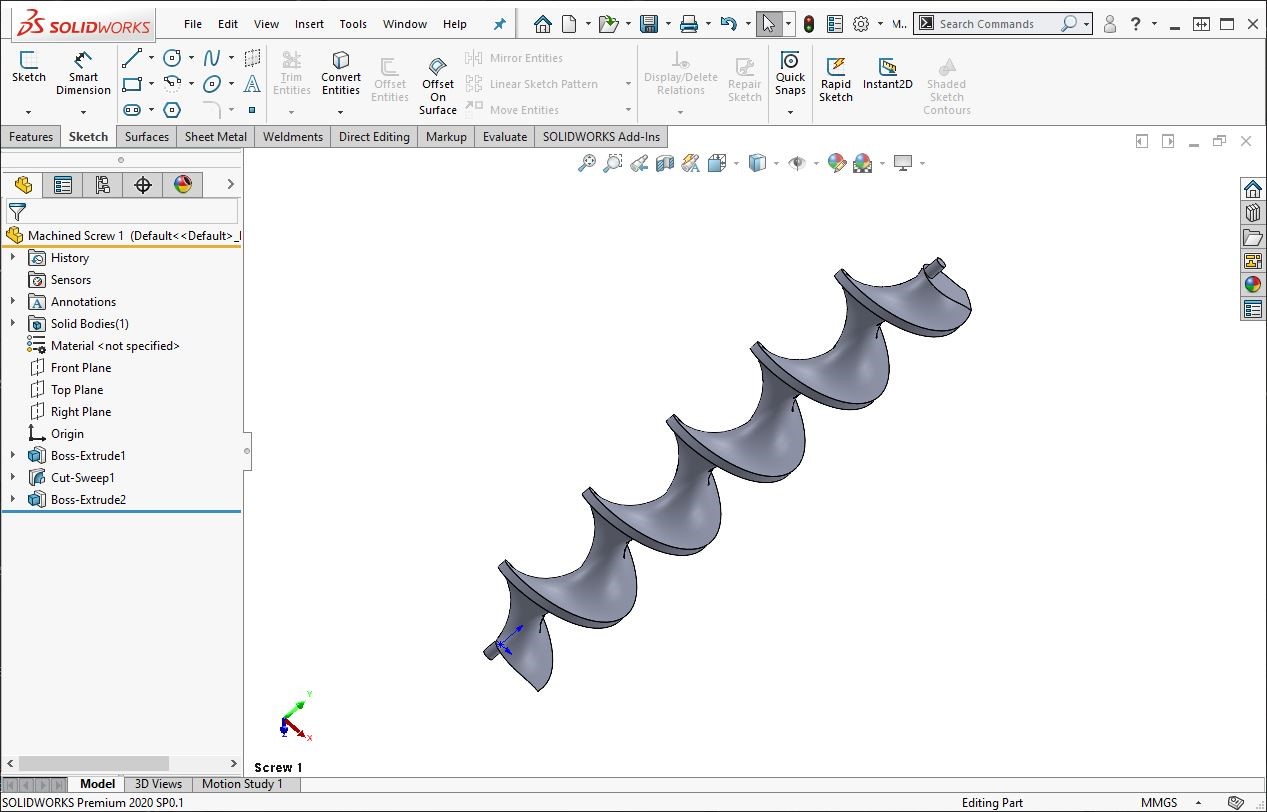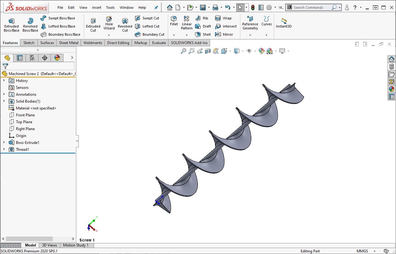 Of course, I could have started with a small central cylinder, and used a Swept Boss to add the material of the screw’s “vane” – so then I thought, hmm, what if people need to do this on a regular basis?