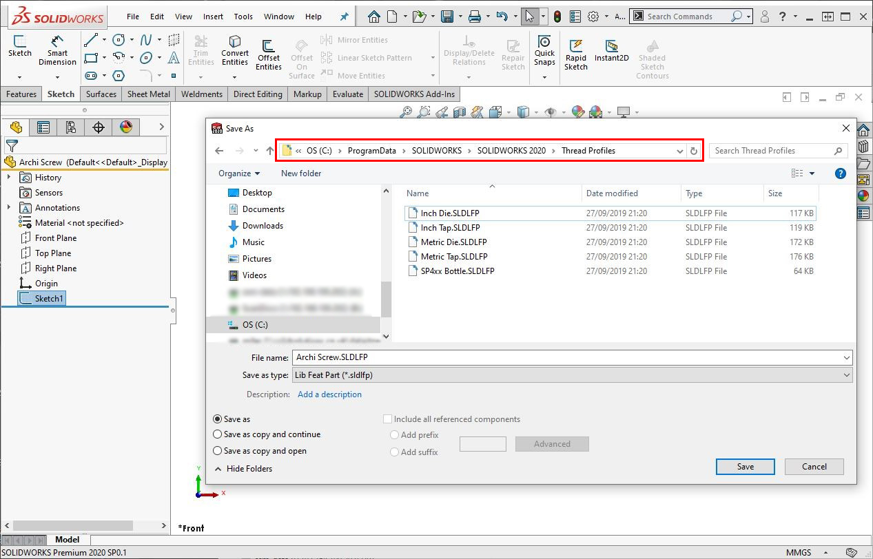 Then you have to exit the sketch, but have the sketch selected on the tree, and then go to File, Save As and (before you browse anywhere) change your file type to Lib Feat Part (Library feature).