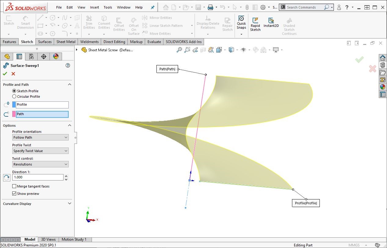 The trick is to use the setting “Specify Twist Value” over on the left where it says “Profile Twist.” Hit the green tick, and this is what you get: -