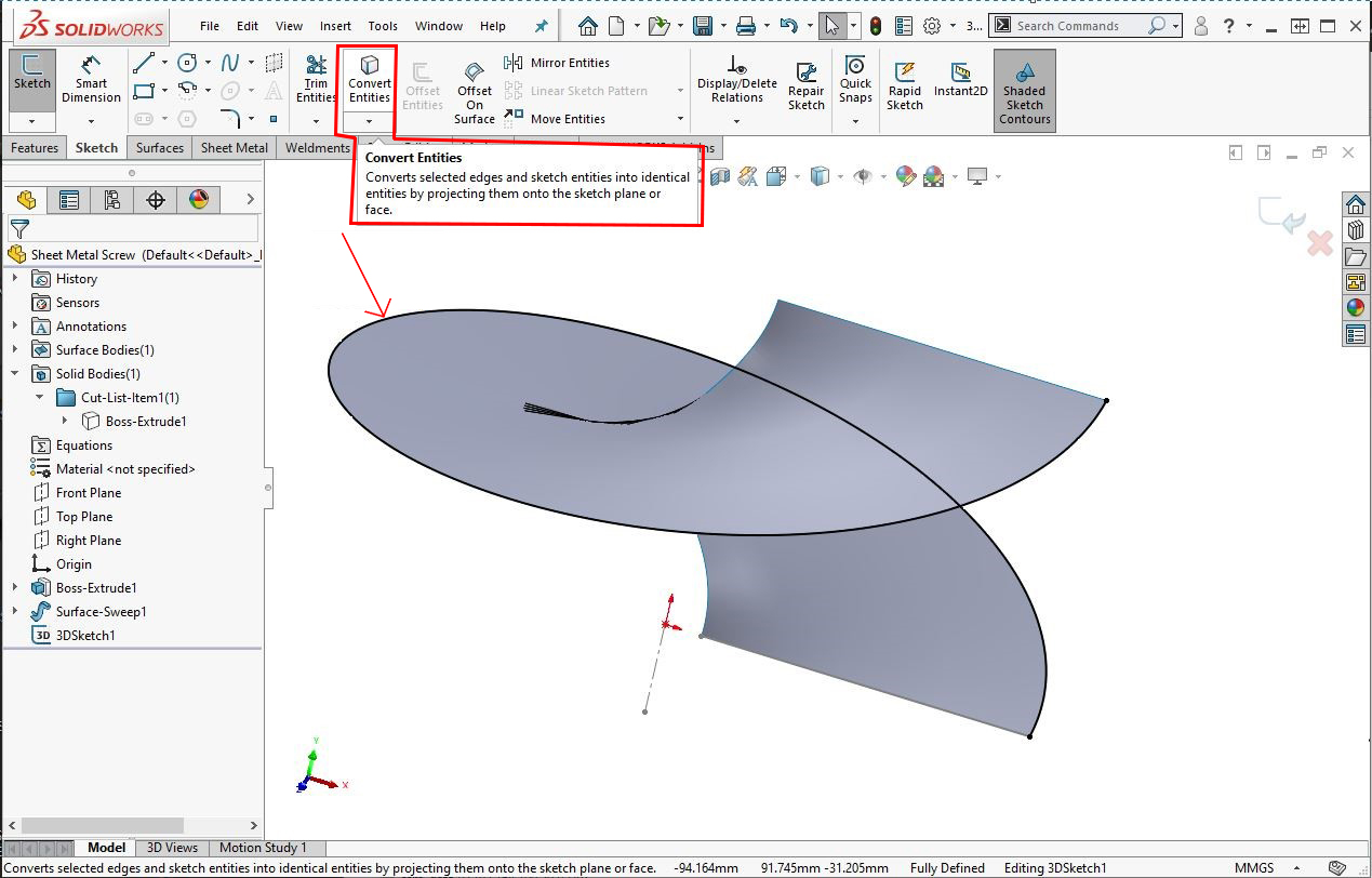 The reason for creating this surface is solely to use to create two spiral lines – each one in it’s own 3D sketch. So it is a case of opening up a new empty 3d sketch and using Convert Entities to put lines in 3d over each edge of the swept surface: -