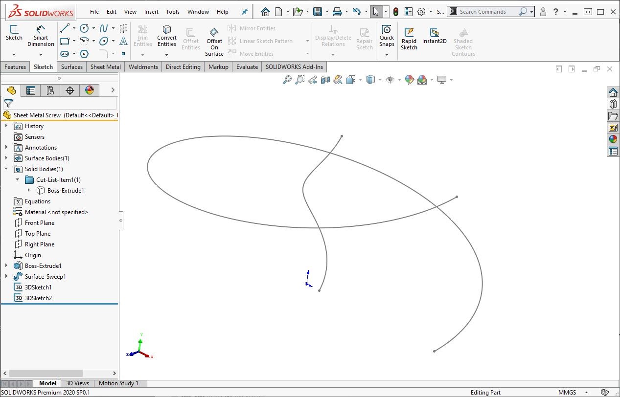 Once that is done for the other edge in a separate 3d sketch, we can hide the surface body and see what we have: -