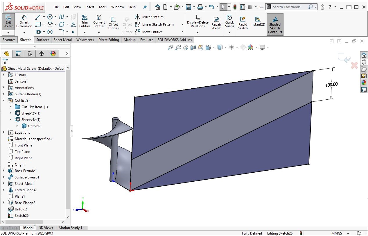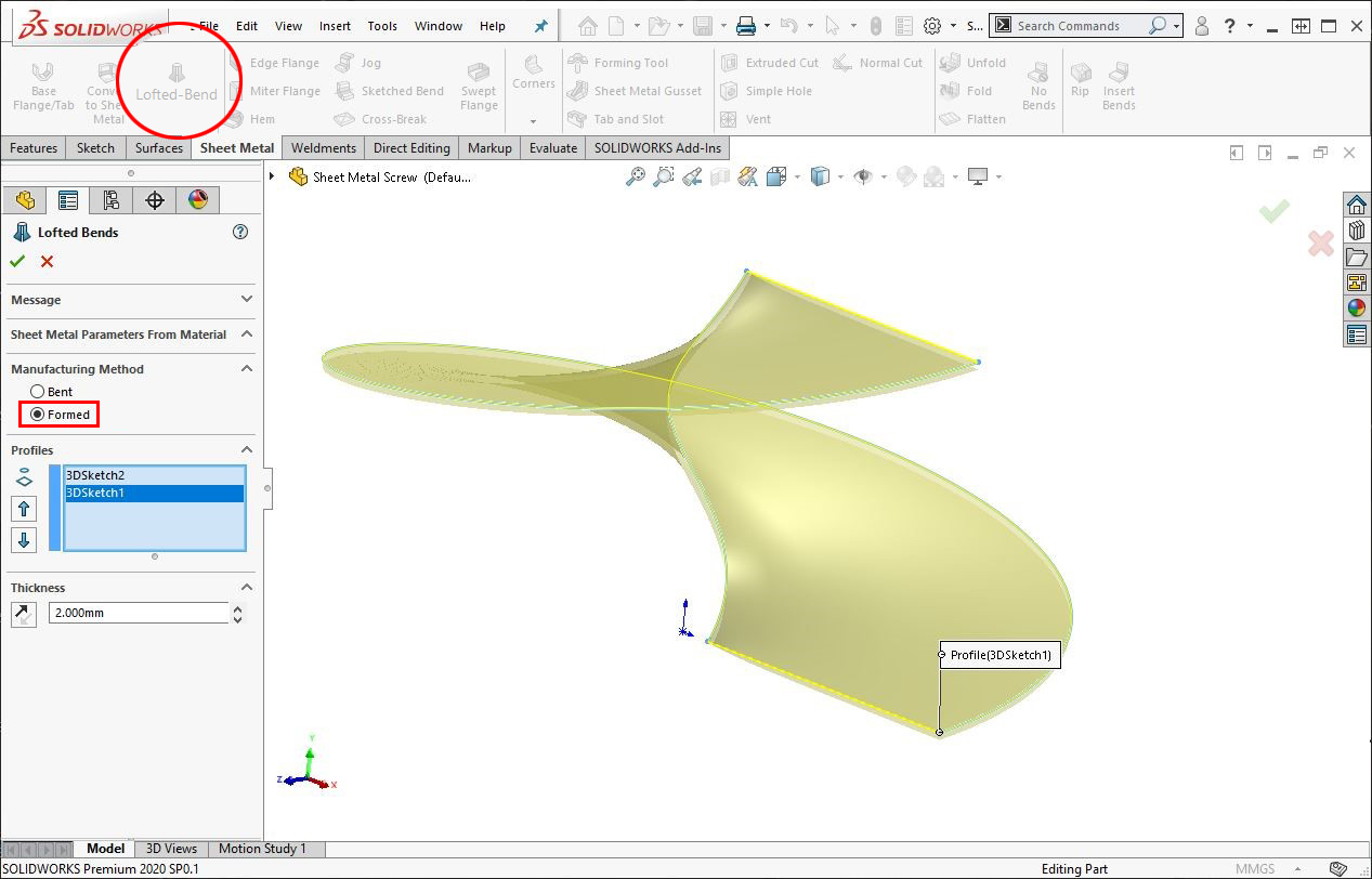 Then we can use the Sheet Metal command Lofted Bend and pick the 3d sketch lines: -