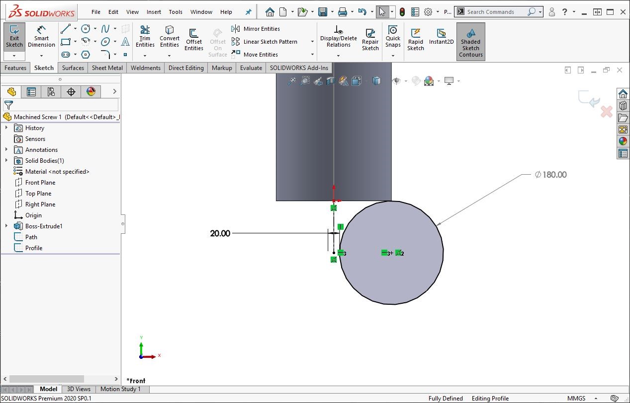 Then I drew a path sketch as before – the same length as the cylinder this time, and another sketch for a profile – this time as a single line with one end stuck onto the outside of the cylinder.