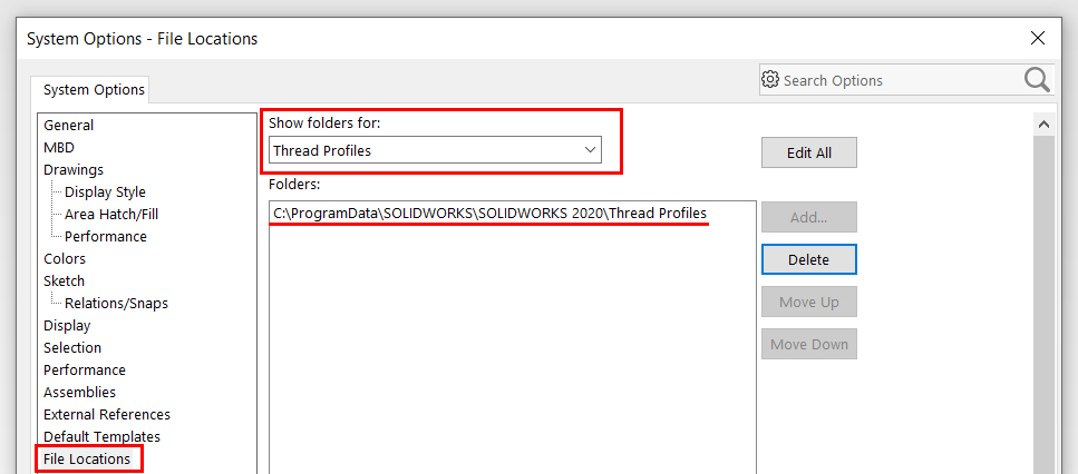 What that command will need is a sketched profile, saved as a Library Feature into the location on your PC that is listed under System Options, File Locations, Thread Profiles: -