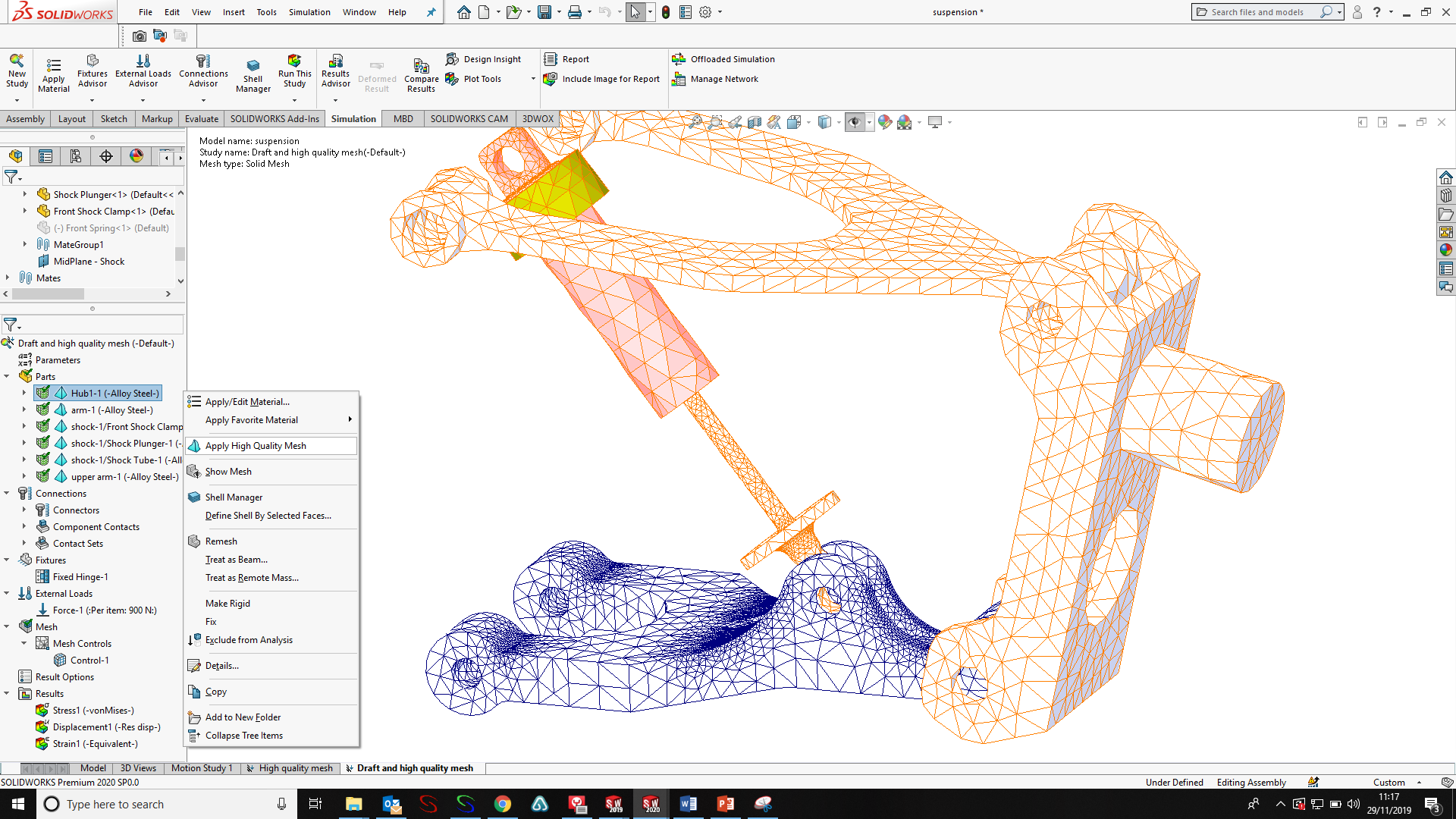 In 2020, the hybrid mesh is currently only available for linear static studies with solid bodies. However, results from linear static studies with hybrid meshes are valid as input for dependent study types such as Fatigue, Pressure Vessel, Design, and Sub-Modelling studies.