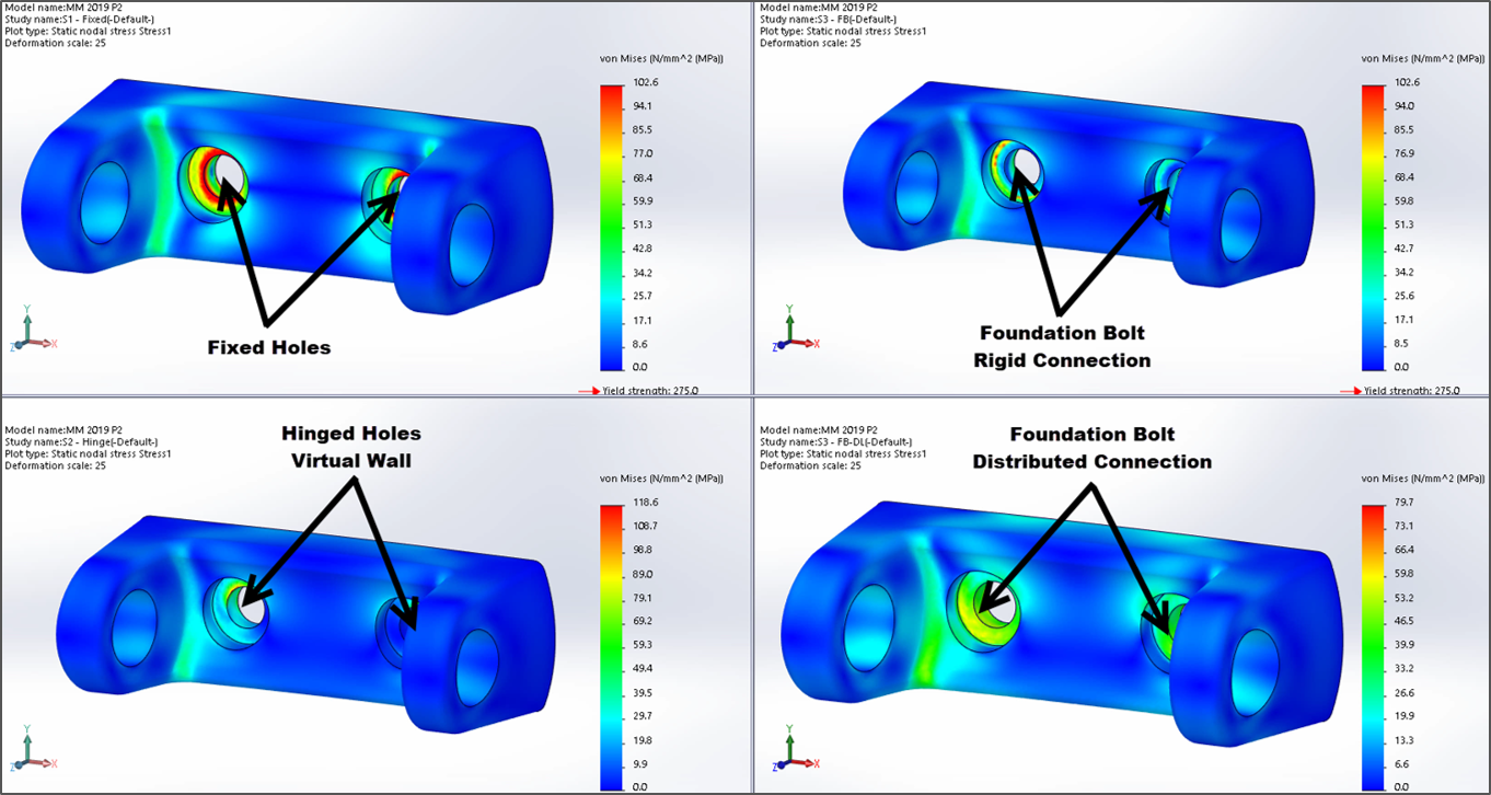 In 2019, a ‘distributed’ as well as a ‘rigid’ connection type was added for remote loads/masses. In 2020, this option is now also available for pins and bolts. The ‘rigid’ formulation prevents the nodes associated to the load bearing entity from deforming relative to each other. This can cause artificially inflated stress results. The ‘distributed connection’ option allows these nodes to deform relative to each other and provides a more representative stress magnitude and distribution.
