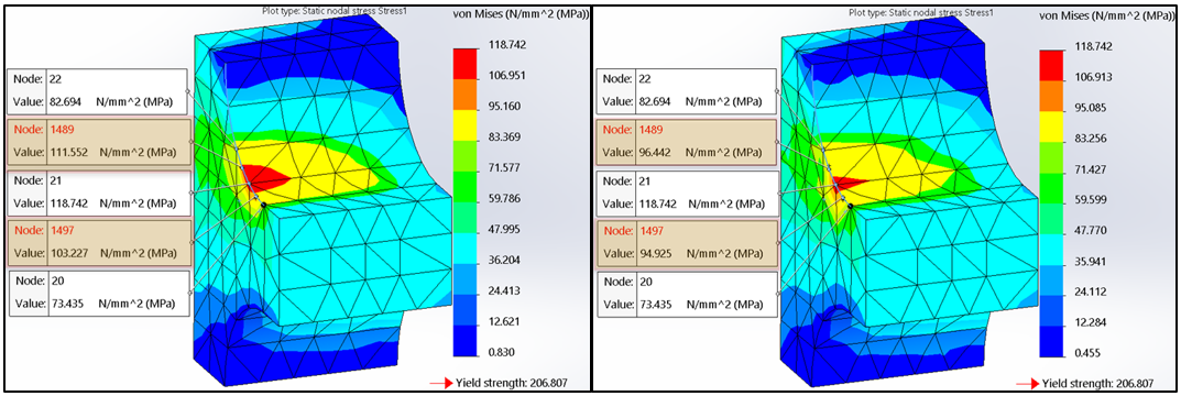 In 2019, an improved stress-averaging algorithm was introduced that yields better stress results for the mid-side nodes of high quality elements, most notably within areas of high curvature. In 2020, this capability is extended to linear dynamic studies and now covers all study types.