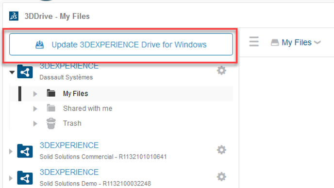 Using the north part of the Compass (Social and Collaborative), access the 3DDrive App and if required you will see a button to allow the Windows installation to update. Clicking this starts the update process.