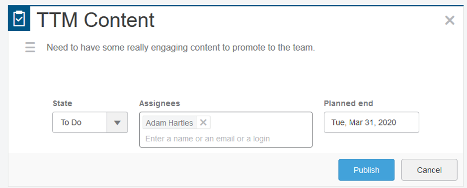 This is a great addition to the entry level Collaborative Business Innovator role. Within your Communities, the WeDo post can act as a simple Task Assignment tool. You can assign the task to a Platform user (up to 10 assignees per WeDo), set its state and planned end date. The three states allowed are ‘To Do’, ‘In Progress’ and ‘Done’ so quite simple, Sticky Note type tasks. WeDo tasks can be tracked using the Project Planner role.