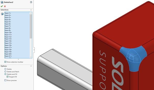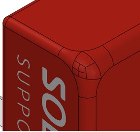 For the more organic corners found on the Pads we used multi-radius fillets paired with setback parameters, the setback parameters allow you to change how the different fillets blend into each other, these settings are all available from within the regular fillet command. Unfortunately this method can create transitions where edges meet it often results in unsightly edges. To improve the aesthetics and smoothness of this corner we used the Delete Face command with the tangent fill option, this allowed us to form a singular face.