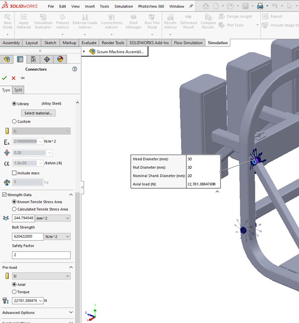 The first great feature we can utilize to save some time is the option to convert toolbox parts to bolt connectors this allows us to enter torque values, strength data and our required factor of safety. We can also test a range of materials or different types of connector if required. Another benefit of these connectors is the run time will be reduced and we don’t need to set up any extra contact sets.