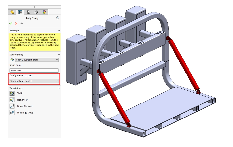 So in this next study we have added some support braces. We have added these in a new configuration so we can quickly copy the previous study, switch the configuration, add the connections and rerun the study