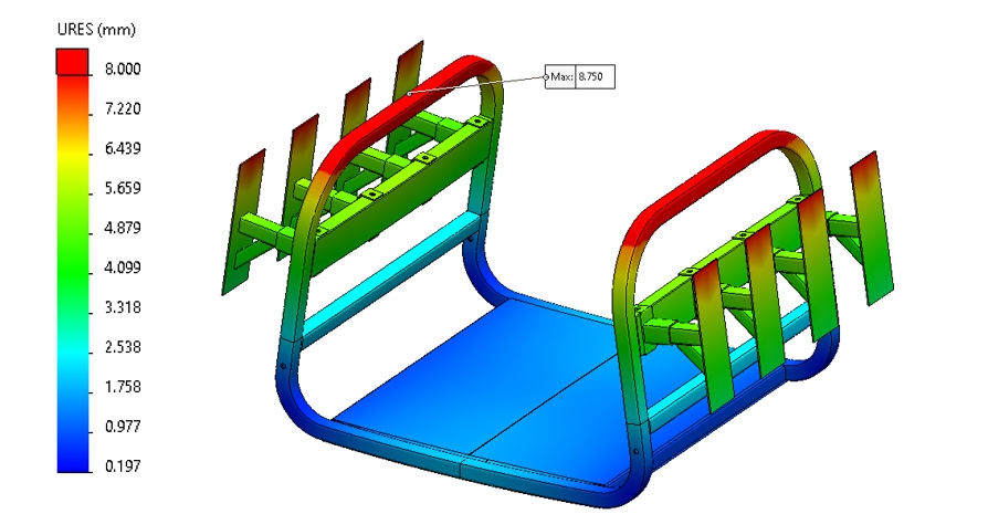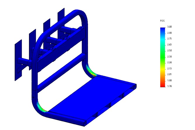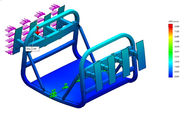 From these results we can see the maximum displacement is reduced from 8mm to 2.4mm! I expect this is largely due to some of the stress being relocated away from the corner sections. However, this does increase stress in other areas so it could also be worth adding additional reinforcements there if we wanted to take this a step further. However this design is now satisfactory as it achieves our desired factor of safety with a minimum of 2.17, This means that even if the forwards output double the amount of force we expect the design would be strong enough to not yield.