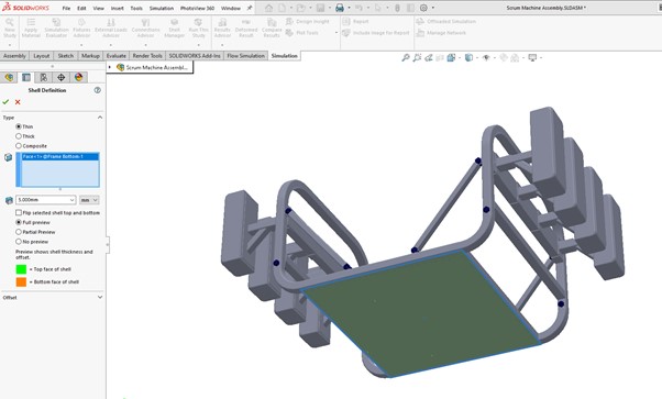 Because there are some large flat plates on this model, we want to ensure shell elements are used for these, using this type of element will help out study to run as smoothly as posible. These can be manually defined or if the model uses sheet metal SOLIDWORKS will convert to this element type automatically. This will massively reduce the computation time by reducing the number of elements in the study and it should aid convergence. Another benefit of shells is it allow us to quickly change the thickness of the plates directly from the simulation should we need to optimise this.