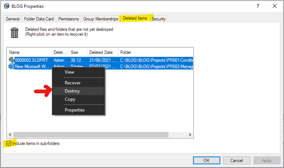 As a PDM Administrator it is important to create and execute a maintenance plan for your vault that includes a review of deleted items. When a user deletes a file in PDM this sets a flag against that file within the database that excludes it from the users explorer window. The associated file in the archive however will remain, until that file is destroyed. This is very similar to normal Windows explorer where deleted files enter the recycle bin on your desktop and if you don't remember to empty that every now and again, you quickly start to run out of disk space.